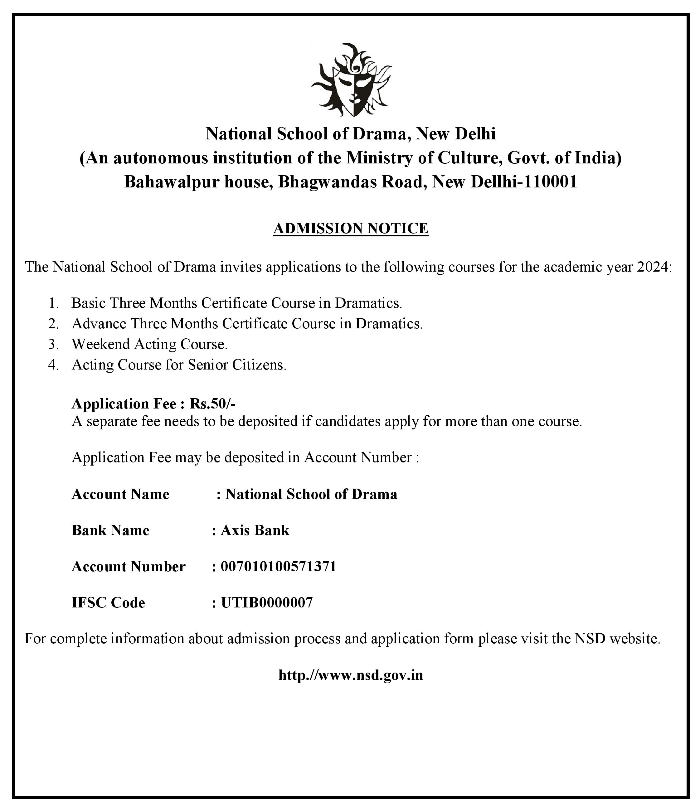 National School of Drama Bahawalpur House, Bhagwandas Road, New Delhi - 110 001 Tel - 011-23389402