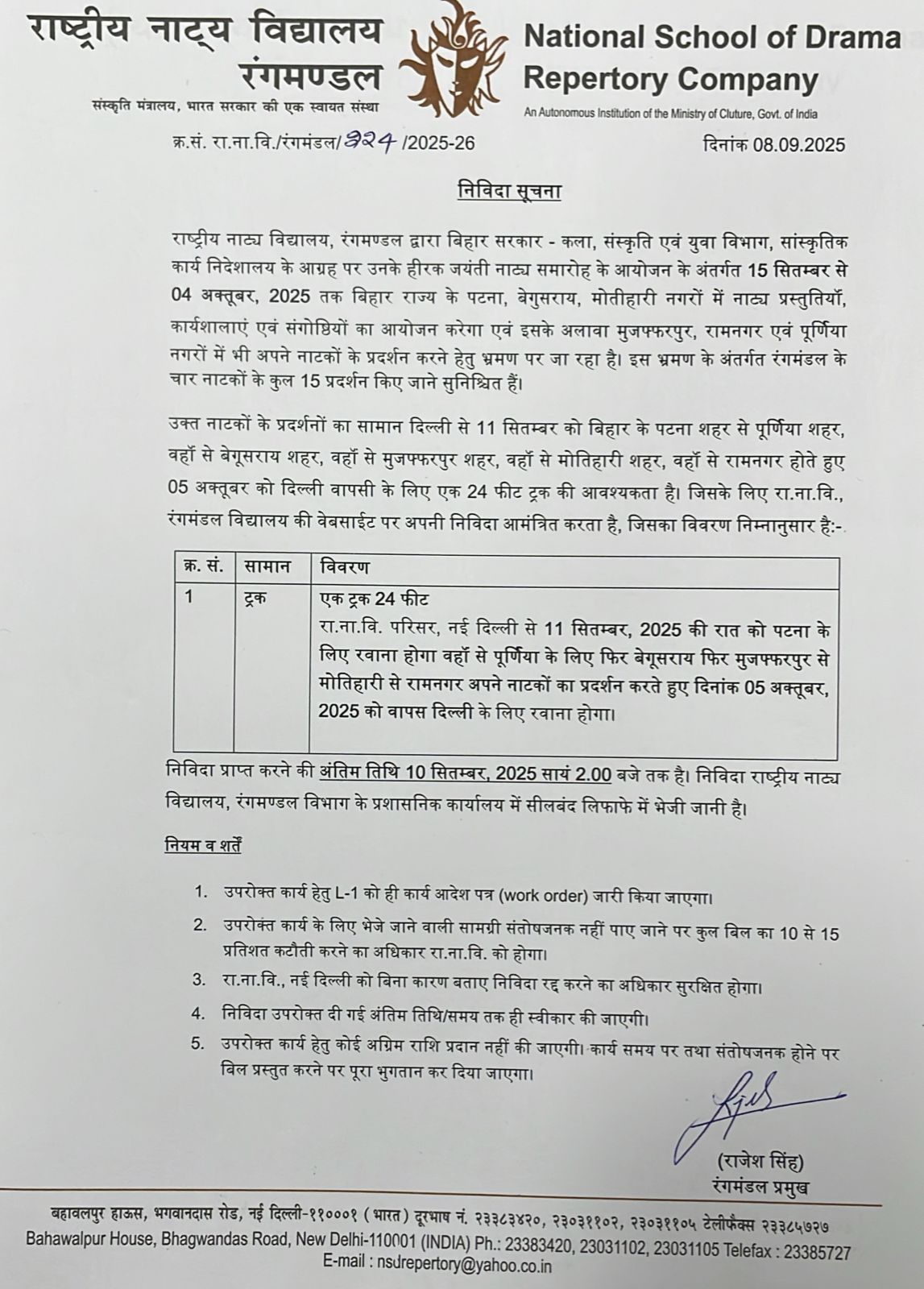 National School of Drama Bahawalpur House, Bhagwandas Road, New Delhi - 110 001 Tel - 011-23389402