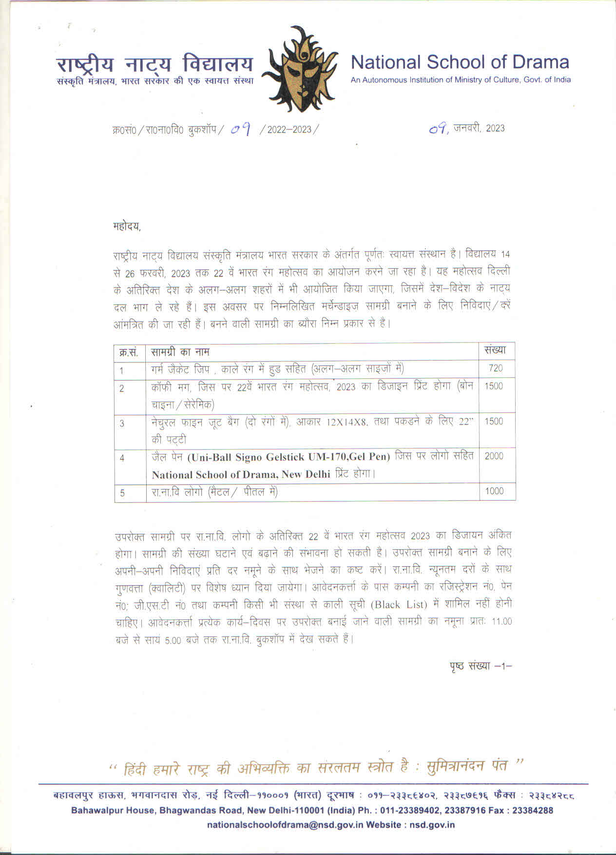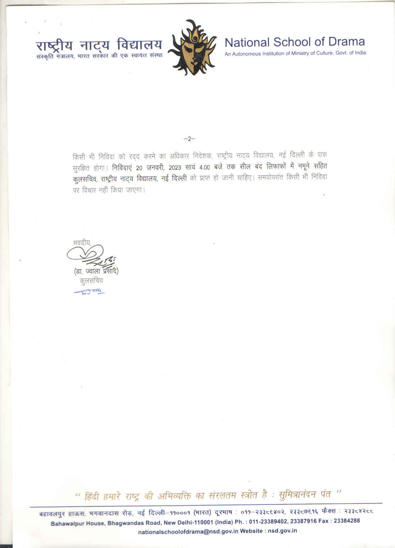 National School of Drama Bahawalpur House, Bhagwandas Road, New Delhi - 110 001 Tel - 011-23389402
