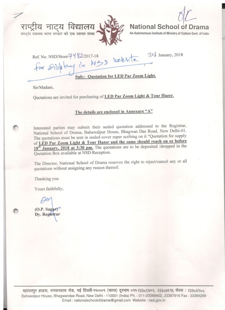 National School of Drama Bahawalpur House, Bhagwandas Road, New Delhi - 110 001 Tel - 011-23389402