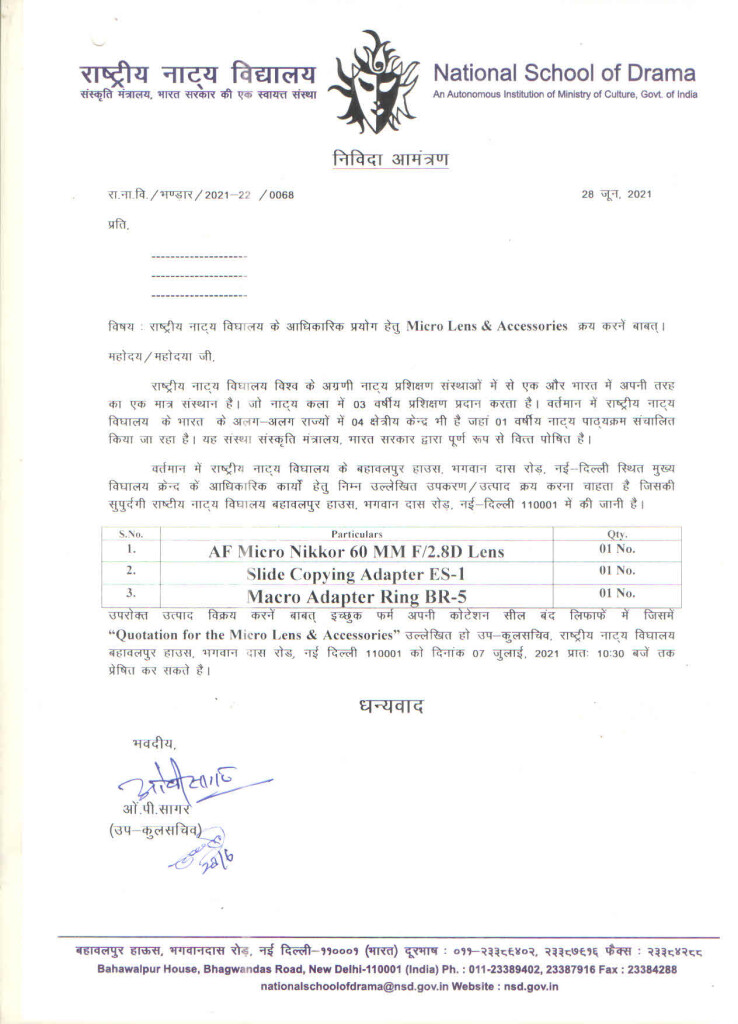 National School of Drama Bahawalpur House, Bhagwandas Road, New Delhi - 110 001 Tel - 011-23389402