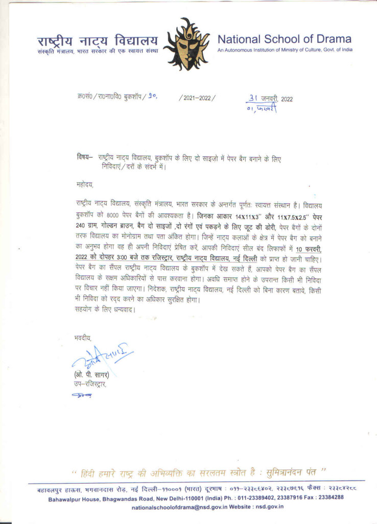 National School of Drama Bahawalpur House, Bhagwandas Road, New Delhi - 110 001 Tel - 011-23389402