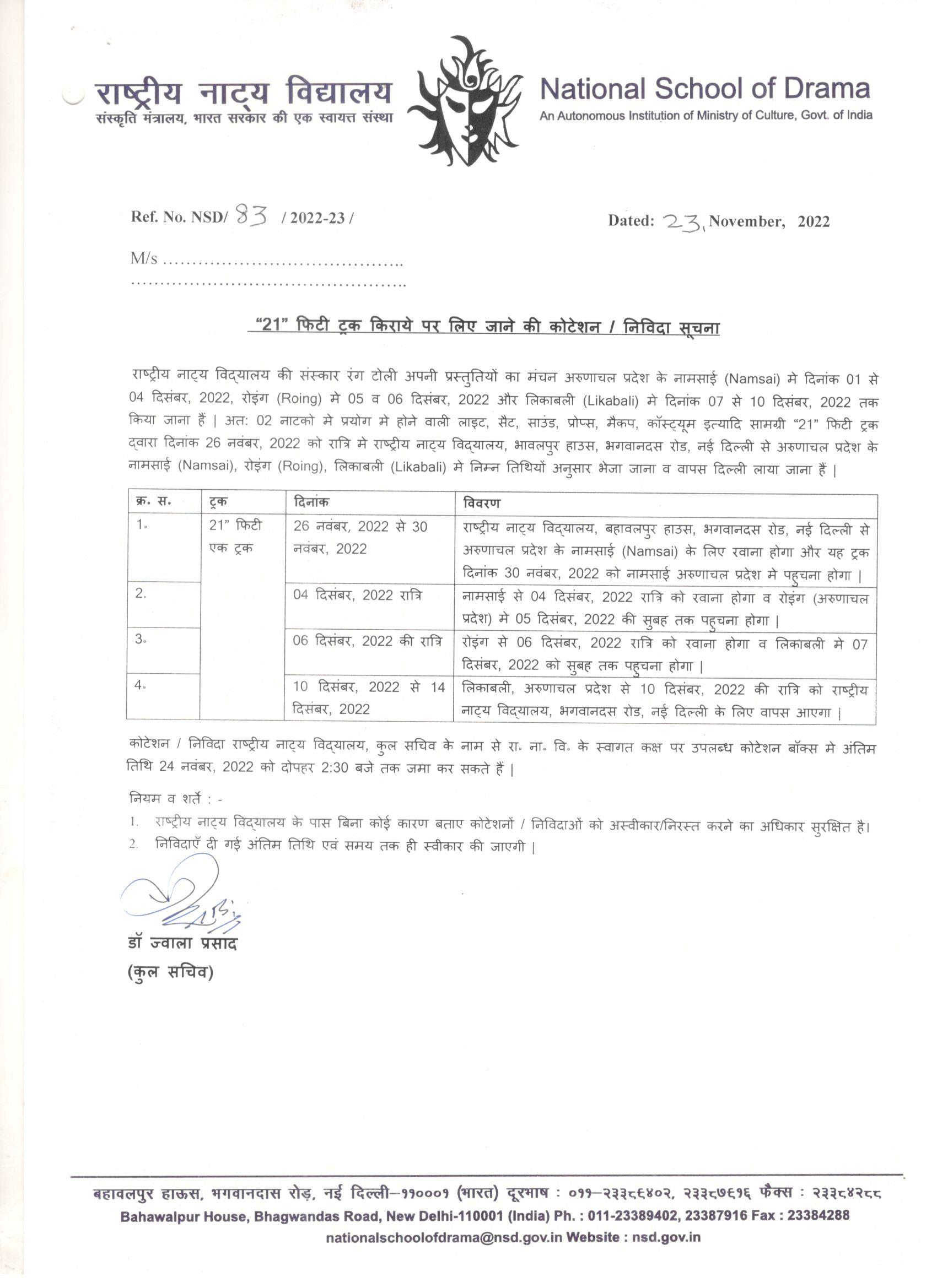 National School of Drama Bahawalpur House, Bhagwandas Road, New Delhi - 110 001 Tel - 011-23389402