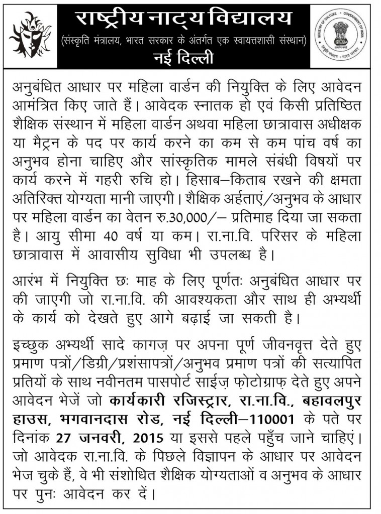 अनुबंधित आधार पर महिला वार्डन की नियुक्ती